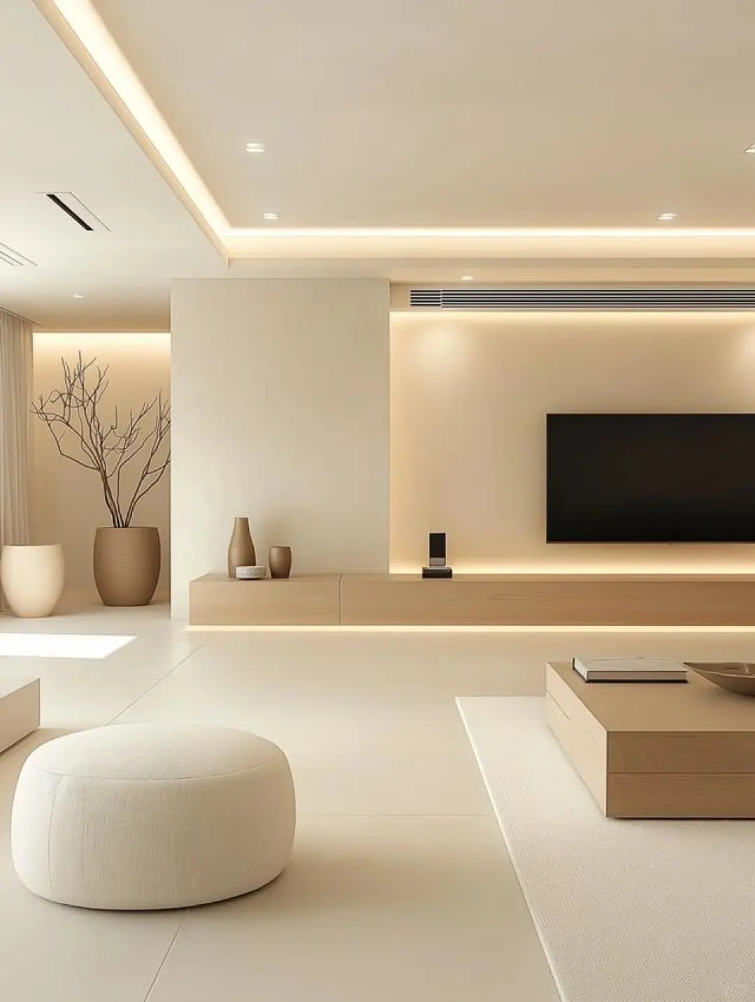 When it comes to hardscape design, minimalist homes emphasize clean and fluid lines, steering clear of complex carvings and ornamentation. They use straight lines and simple geometric shapes to sculpt the aesthetic beauty of the space. For example, in a modern minimalist flat designed for a riverside apartment, the combination of a flat ceiling and a no-main-light design avoids visual clutter. Meanwhile, hidden light strips and spotlights create a soft, inviting lighting atmosphere, making the space feel both simple and layered.